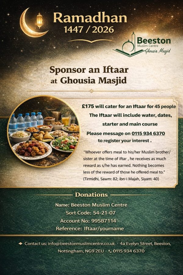 Welcome to Beeston Muslim Centre/Ghousia Masjid, a place of worship, community, and spiritual growth. Whether you are a regular attendee or visiting for the first time, we are honoured to have you with us.